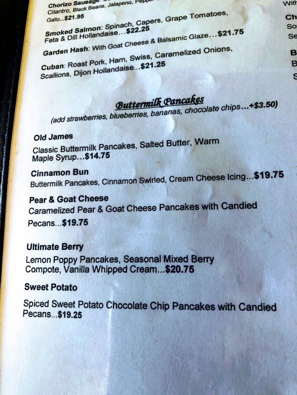 Buttermilk pancakes, cinnamon swirled, cream cheese icing